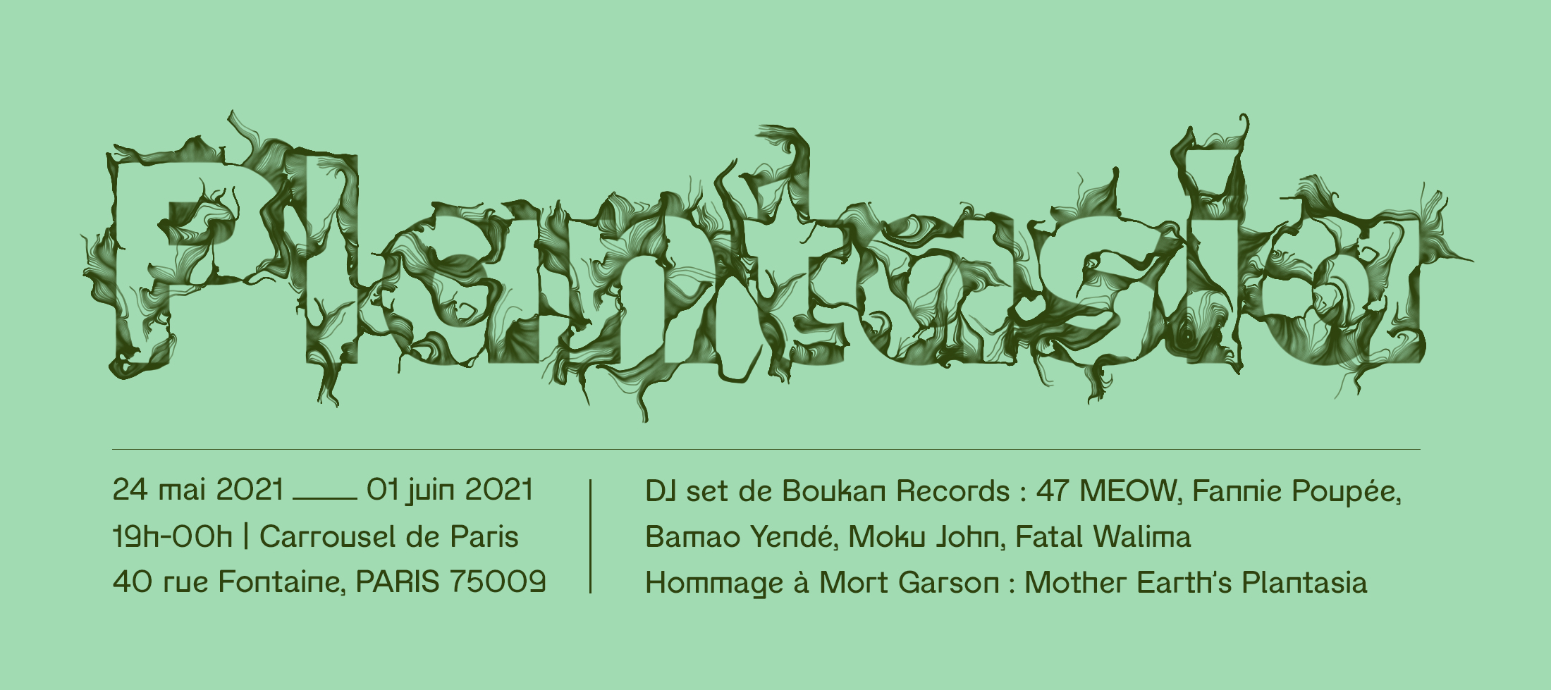 Composition d'une identité pour un événement musical et végétal à l'aide de simulations de comportements naturels dans l'espace numérique. J'ai animé le titre en codant un script P5js, disponible sous licence Creative Commons Attribution ShareAlike sur le site Open Processing.